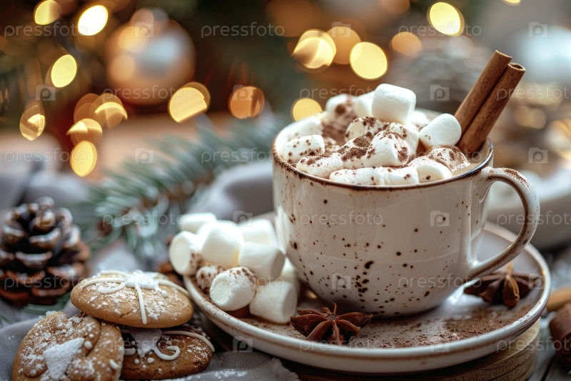 Горячий шоколад с зефирами и палочками из корицы на уютном столе для отдыха
