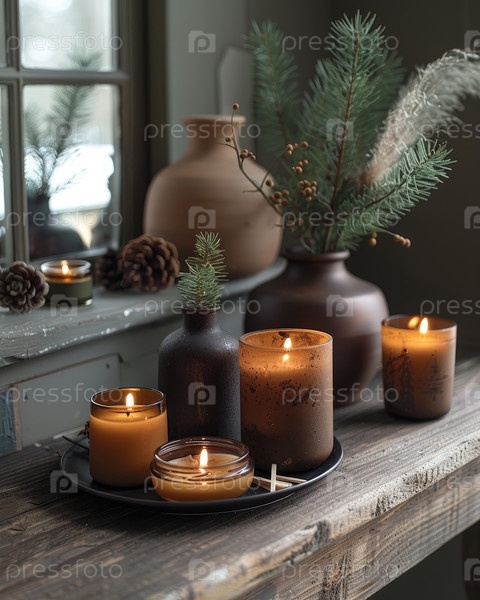 Уютное расположение свечей и декоративных элементов на деревенском деревянном столе с зеленью