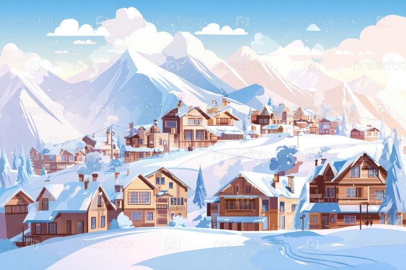 Снежный пейзаж горной деревни с уютными деревянными домами и спокойной зимней атмосферой