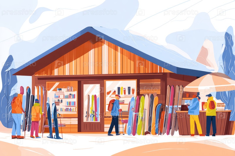 Красочная иллюстрация лыжного магазина с посетителями, которые просматривают и выбирают оборудование в зимних условиях