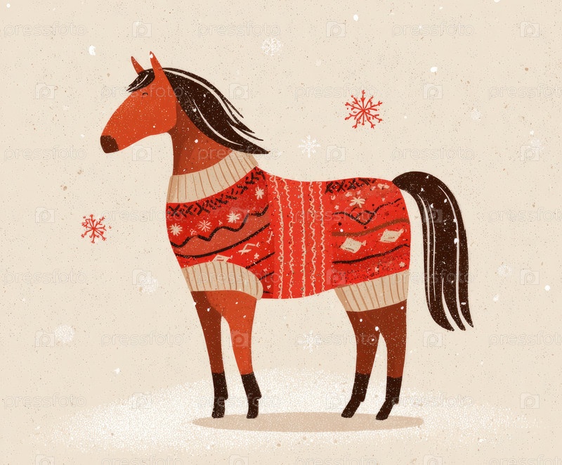 Лошадь в уютном красном свитере с праздничными рисунками в странной зимней обстановке