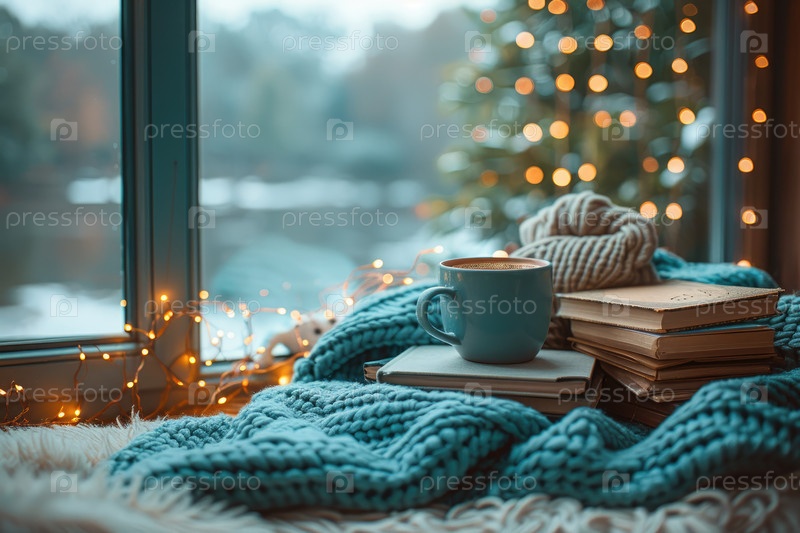 Рождественское или новогоднее украшение - это чашка кофе с книгами. рождественская елка. интерьер гостиной и концепция декора дома на каникулах