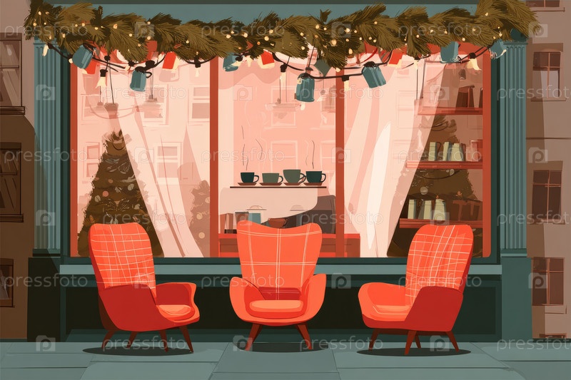 Уютное окно кафе с праздничными декорациями и тремя оранжевыми креслами приглашает вас расслабиться