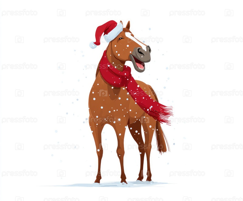 Иллюстрация рождественского коня, лошадь в шляпе Санты, красный шарф вокруг снежин