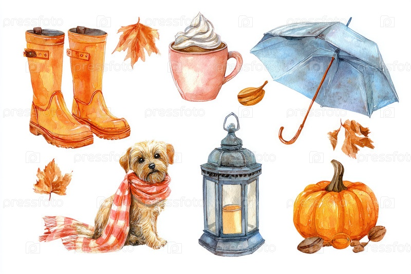 Акварельная сезонная иллюстрация с оранжевыми сапогами, тыквой, фонарем, собакой, зонтиком и осенними листьями в уютном стиле осени