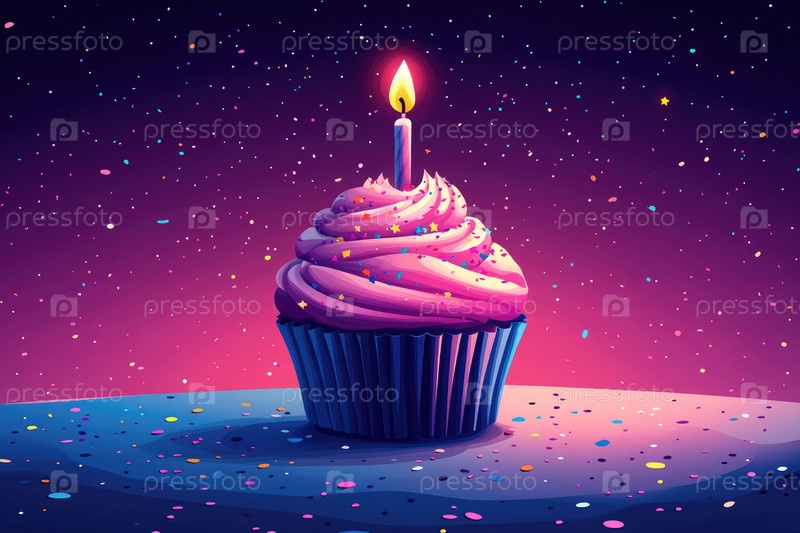 Красочная иллюстрация торта с розовым кремом, свечой и конфетти на праздничном фоне звездной ночи