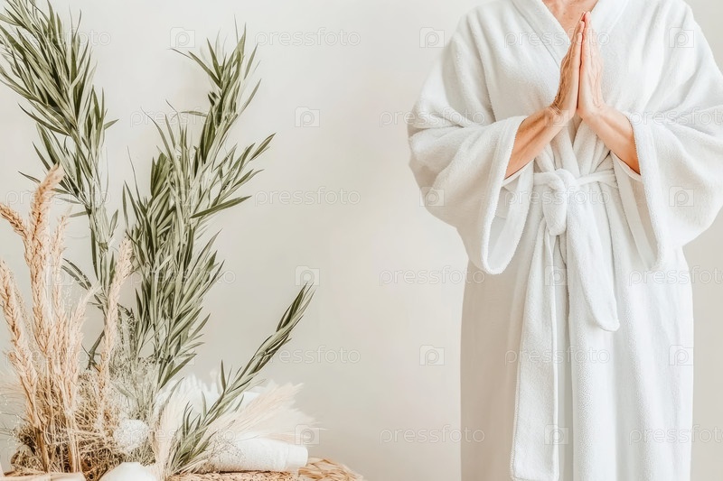 Спокойная минималистическая спа-концепция с женщиной в белом пальто, руками в молитвенном жесте, естественными сушеными растениями на заднем плане