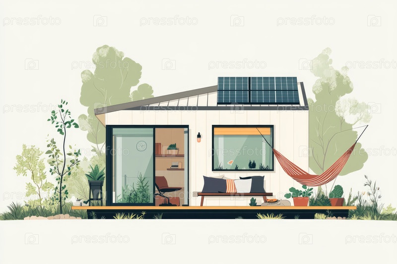 Плоская иллюстрация современного экологически миниатюрного дома с солнечными батареями, гамаком и растениями.Минималистская архитектура и устойчивый образ жизни