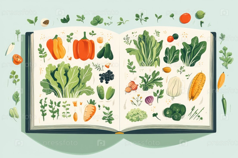 Иллюстрация открытой книги с овощами и травами.Образовательная и декоративная концепция садоводства, сельского хозяйства и здорового питания