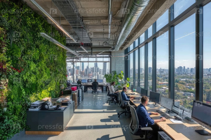 Современный офисный интерьер с вертикальной зеленой стеной и панорамным видом на город