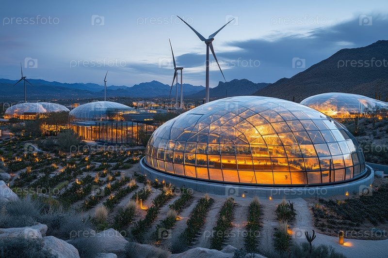 Футуристические экокуполы с светящимися интерьерами и ветряными турбинами в пустынном пейзаже на закате