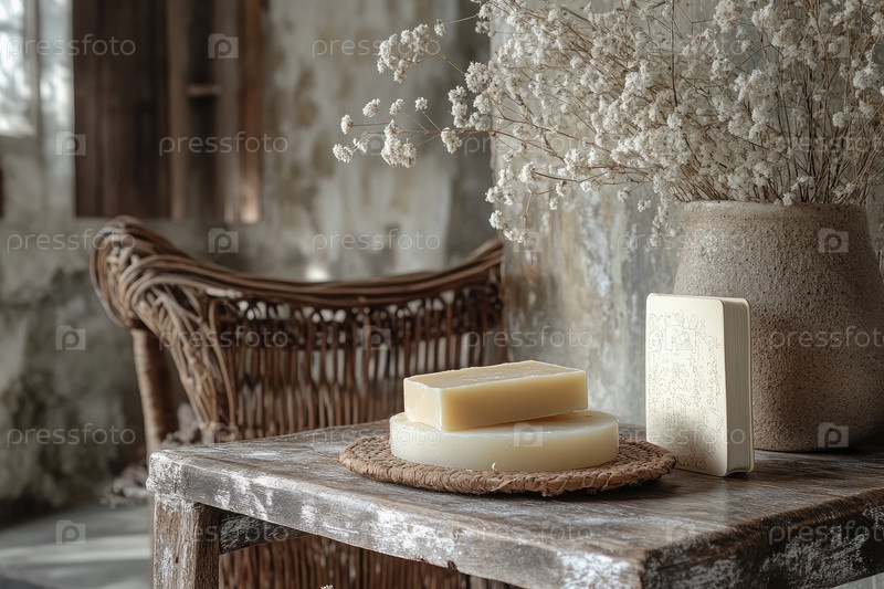 Красочная сцена с натуральным ручным мылом, сушеными цветами, винтажным стулом и мягким теплым освещением.Экологическая концепция органического ухода за кожей