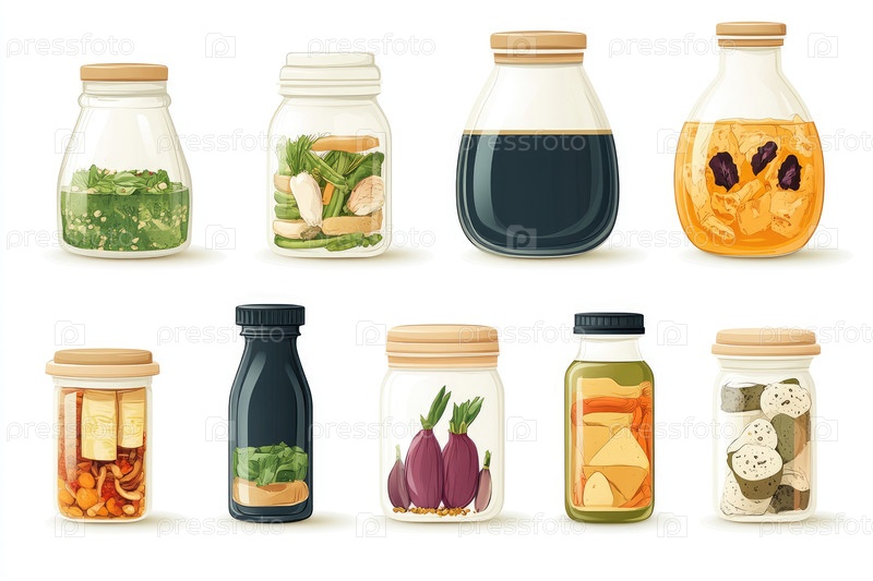 Коллекция стеклянных банок с овощами и иллюстрацией приправ