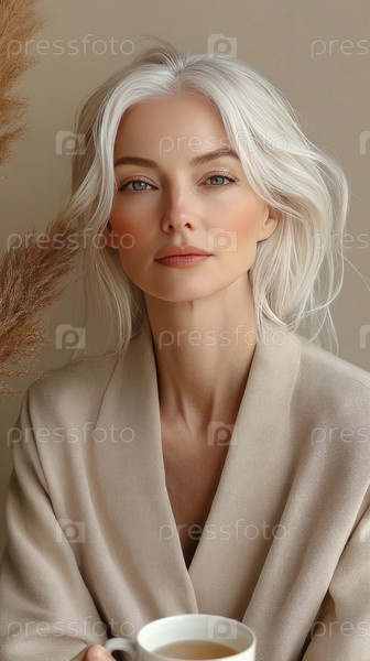 Элегантная зрелая женщина с белыми волосами пьет чай