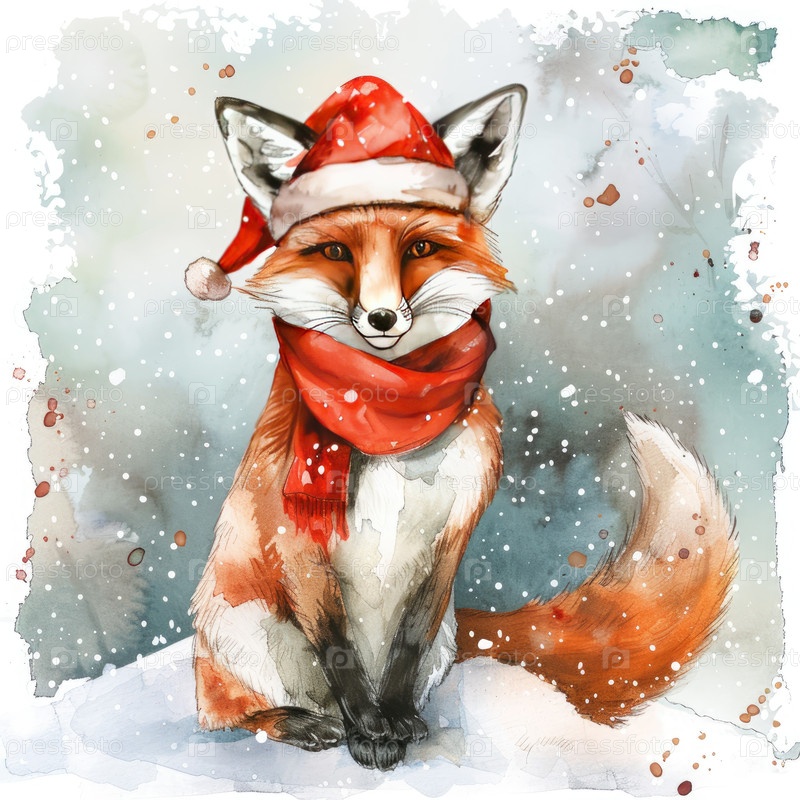 Рождественская лиса в шляпе Санты и красном шарфе