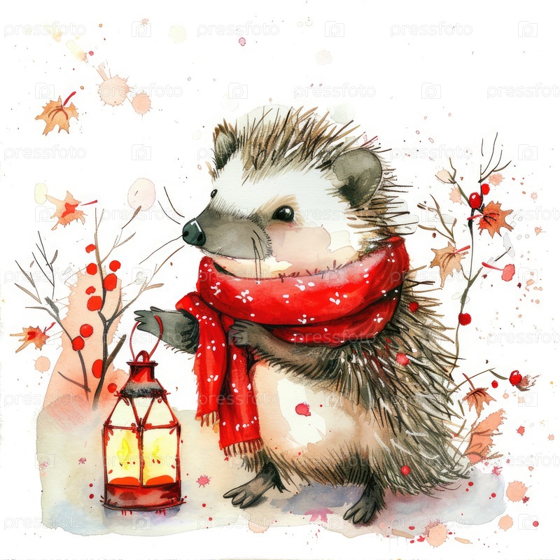 Изображение ежа с красным шарфом и праздничным фонарем