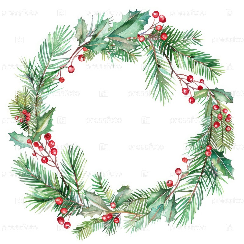 Рождественский венок с иллюстрациями ягод Холли и сосновых ветвей