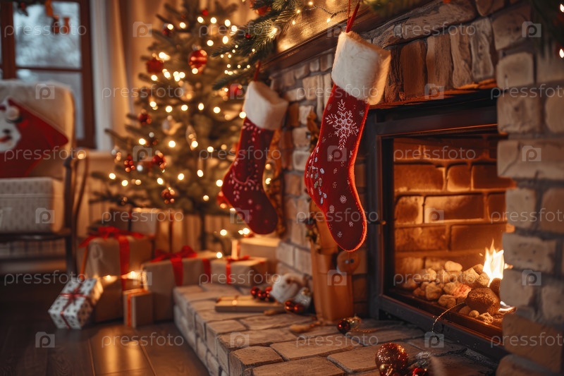 Уютный рождественский камин с чулками и праздничной фотографией елки