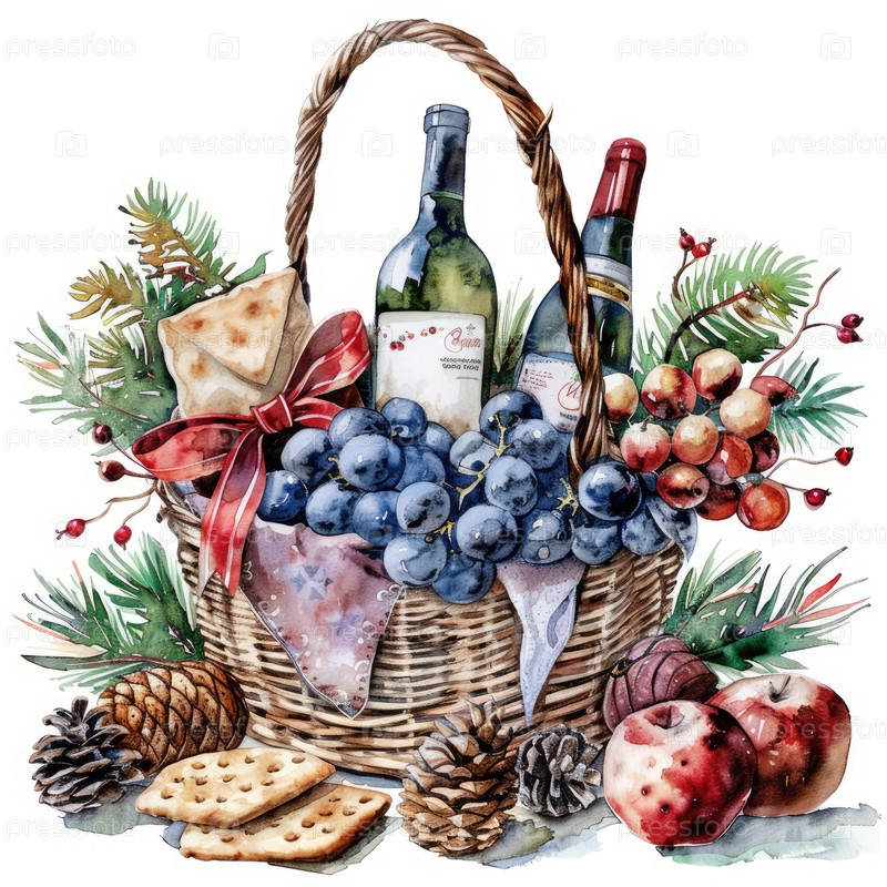 Курортная корзина с вином, виноградом и фруктами, украшенными сосновыми конусами. акварельные краски праздничных натюрморта для сезонных открыток и плакатов