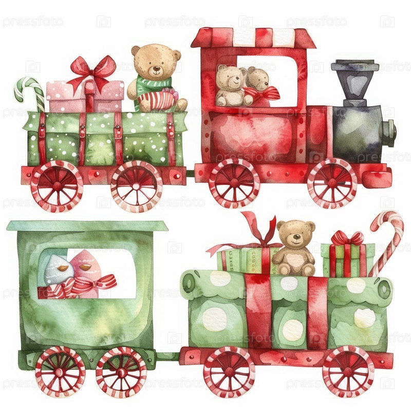 Очаровательный акварельный поезд, наполненный плюшевыми медведями, подарками и конфетами идеально подходит для праздничных открыток и детского дизайна