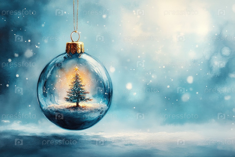 Стеклянный рождественский орнамент с светящейся елкой внутри на сине-снежном фоне, праздничное украшение
