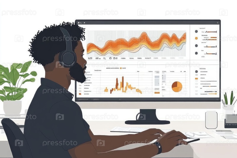 Иллюстрация человека с наушниками, работающего на компьютере, анализ данных и диаграммы на большом экране