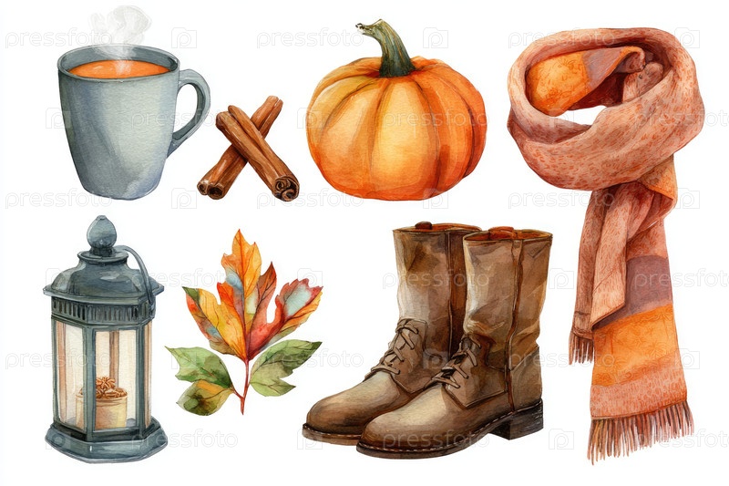Плоская осенняя иллюстрация показывает уютную сцену с тыквой, теплым напитком, сапогами и красочными листьями, создавая сезонную атмосферу, идеально подходящую для осенних дизайнов