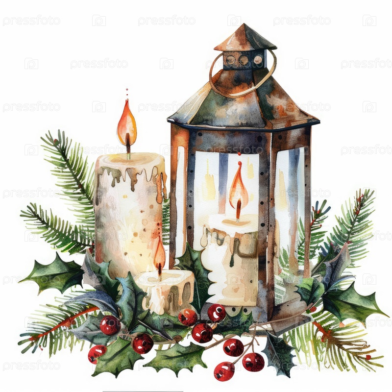 Эта акварельная иллюстрация представляет собой очаровательный фонарь с светящимися свечами, окруженный пышными сосновыми ветвями, создавая теплую и приглашающую атмосферу праздника