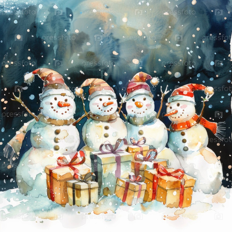 Четыре веселых снеговика, украшенных красочными шляпами и шарфами, счастливо празднуют зимние каникулы, окруженные красиво упакованными коробками для подарков в заснеженном пейзаже, создавая праздничную атмосферу