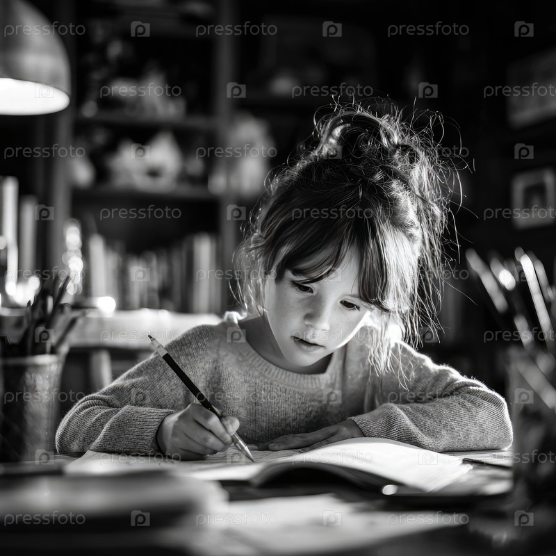 Молодая девушка с кудрявыми волосами глубоко занята написанием в своей тетради за уютным письменным столом, окружена предметами искусства и книгами, создавая тёплую и приглашающую атмосферу для творчества