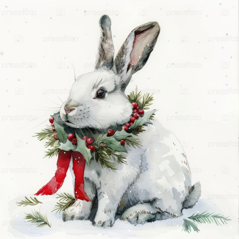 Белый кролик, украшенный ярким венком из красных ягод и зеленых листьев, грациозно сидит в зимнем пейзаже, окружен мягкими снежинками, создавая очаровательную атмосферу праздника