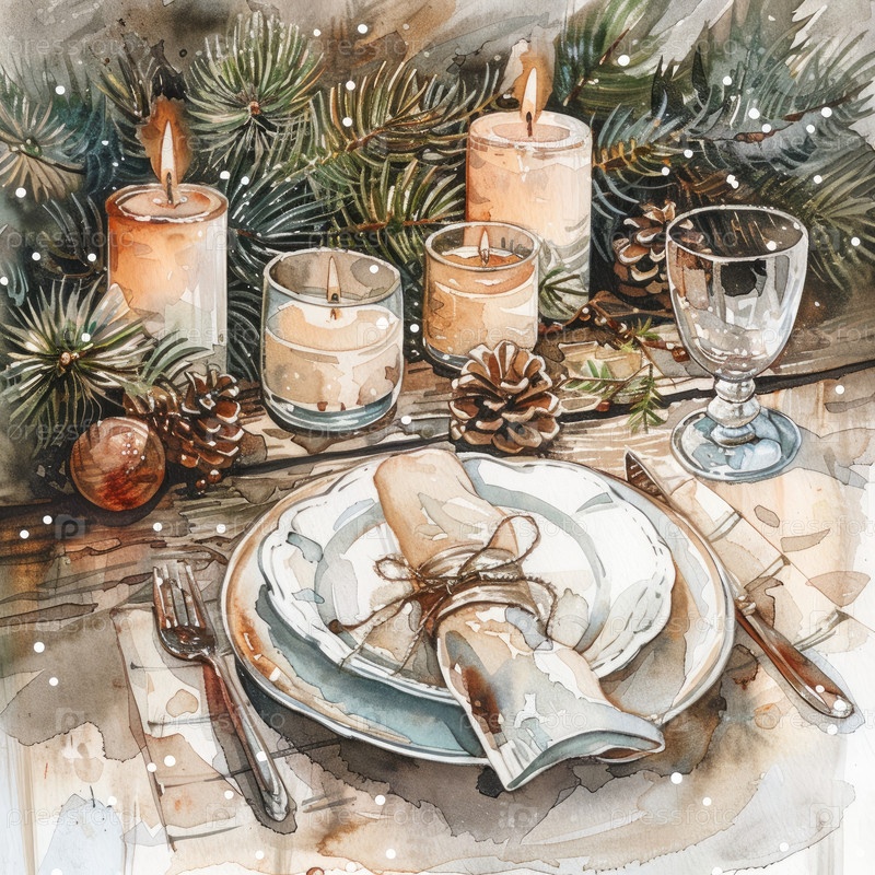Илюстрация акварели, изображающая красиво устроенный обеденный стол с элегантными тарелками, свечами и сосновыми украшениями, создавая теплую и привлекательную атмосферу для праздничных собраний