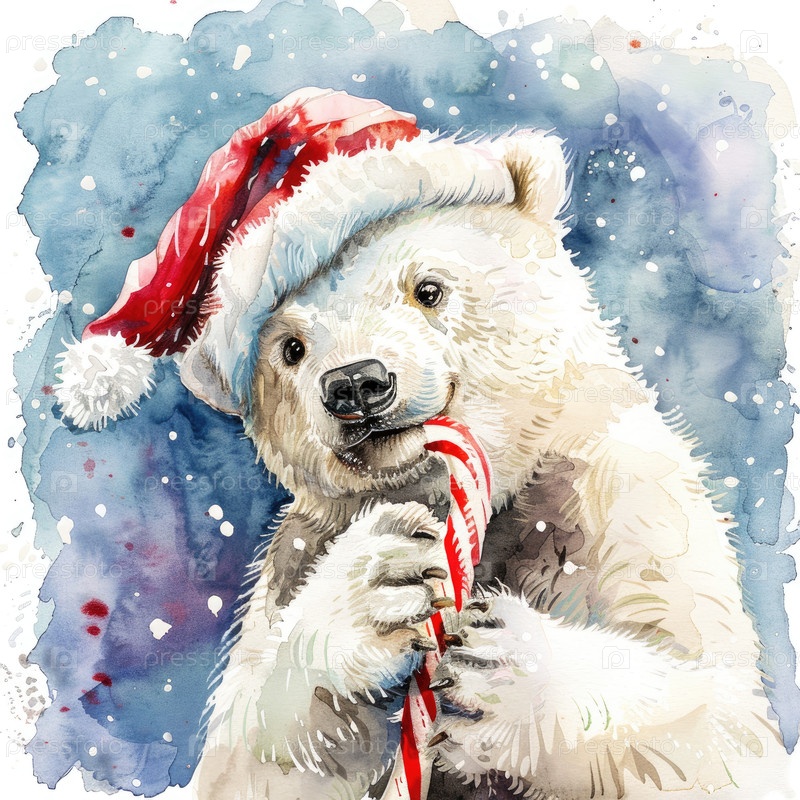 Веселый белый медведь, украшенный шляпой Санты, игриво держит кондитерскую трость в окружении снежного фона, создавая восхитительную зимнюю атмосферу, наполненную праздничным духом