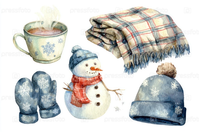 Акварельная иллюстрация с веселым снежным человеком в синей шляпе и красном шарфе, а также уютные зимние аксессуары, такие как перчатки, одеяло и чашка горячего шоколада, вызывают тепло и комфорт
