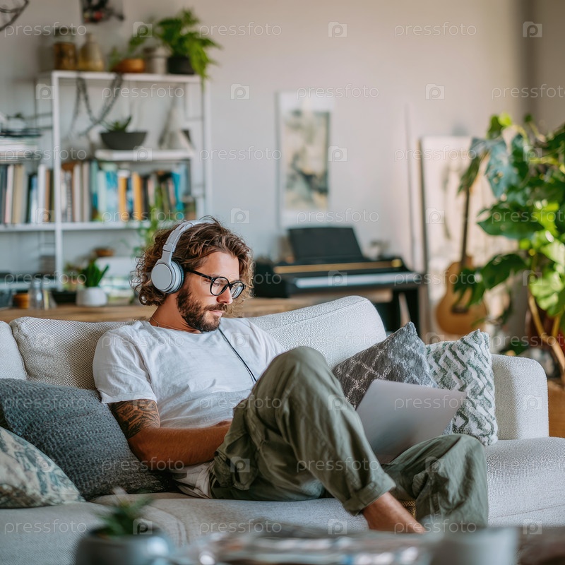 Молодой человек с кудрявыми волосами фокусируется на своем ноутбуке, в то время как он носит наушники, удобно сидит на диване, окруженном подушками, растениями и теплой, привлекательной атмосферой гостиной