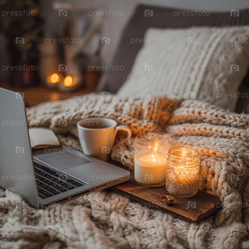 Уютное рабочее место с ноутбуком, свечами и кофе на вязанном одеяле для теплой атмосферы