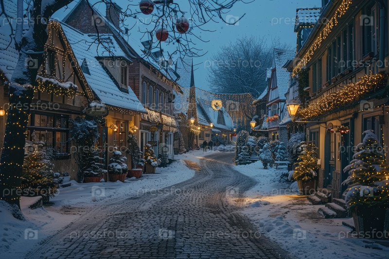 Заснеженная улица в живописной деревне с красиво украшенными домами со мерцающими огнями, создавая теплую и привлекательную атмосферу в зимний сезон, идеально подходит для праздничных торжеств