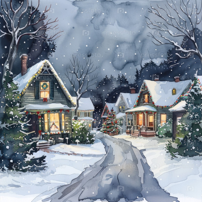 Очаровательный зимний пейзаж с праздничными домами, украшенными огнями, заснеженной дорогой и вечнозелеными деревьями, создает спокойную атмосферу