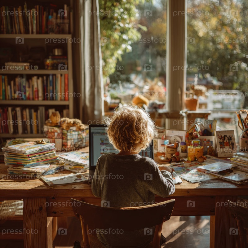 Ребенок с кудрявыми волосами сосредоточен на творческих задачах за деревянным столом, в окружении ярких материалов и естественного света, показывающих воображение и игру