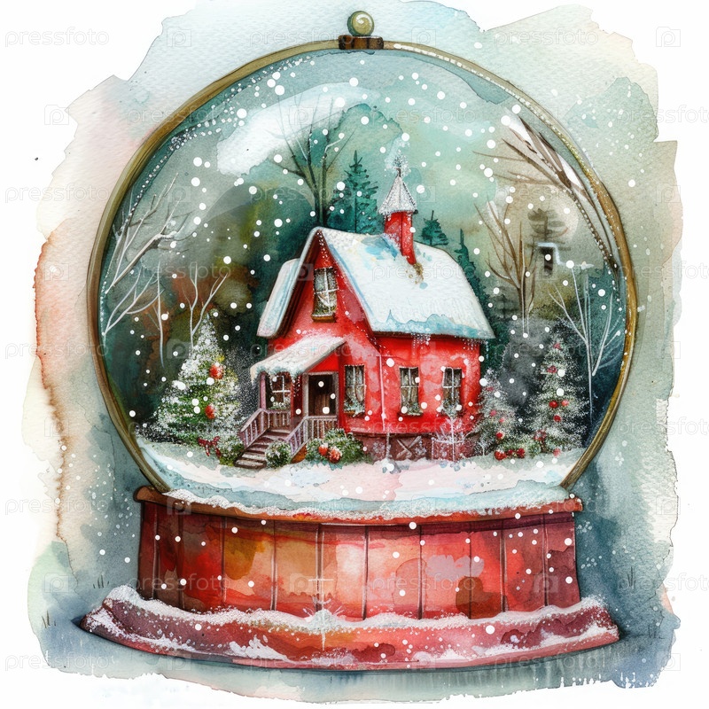 Красочная иллюстрация снежного шара показывает очаровательный красный дом с вечнозелеными деревьями и падающими снежинками, создавая праздничную зимнюю сцену