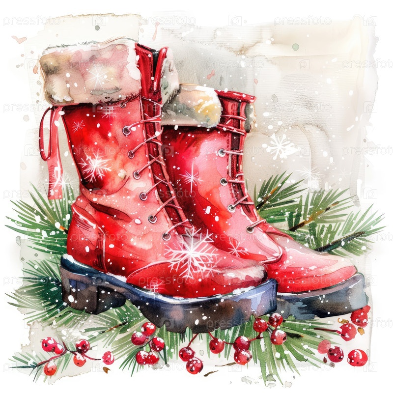 Ярко-красная иллюстрация зимних сапог, окруженных сосновыми ветвями и снежинками, идеально подходит для праздничных тем и украшений