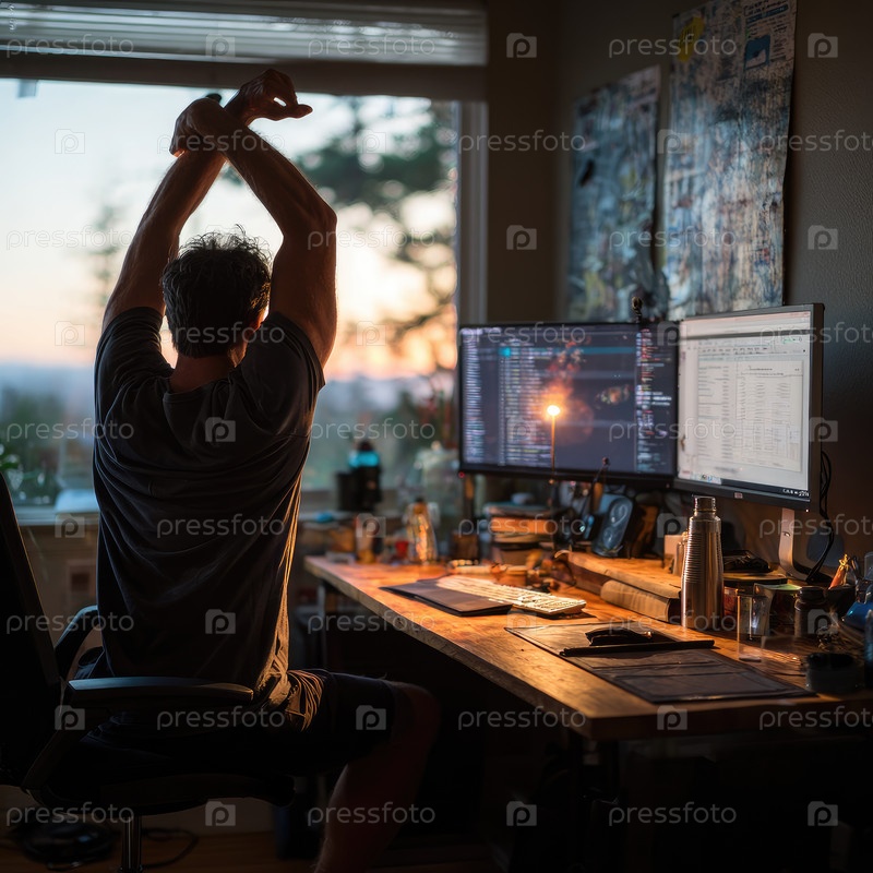 Мужчина-профессионал протягивает руку к своему столу с двойными мониторами, имея вид на красивый закат солнца, создавая расслабленную и вдохновляющую атмосферу