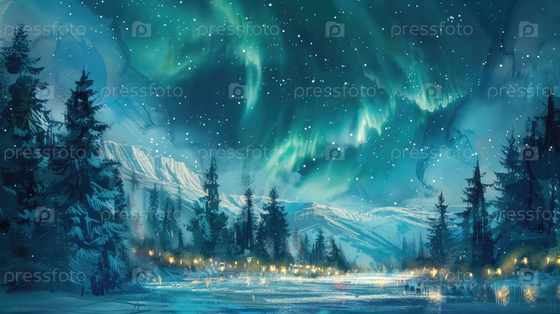 Потрясающее северное сияние создает яркий дисплей над спокойным зимним пейзажем со снежными деревьями и отражающей рекой