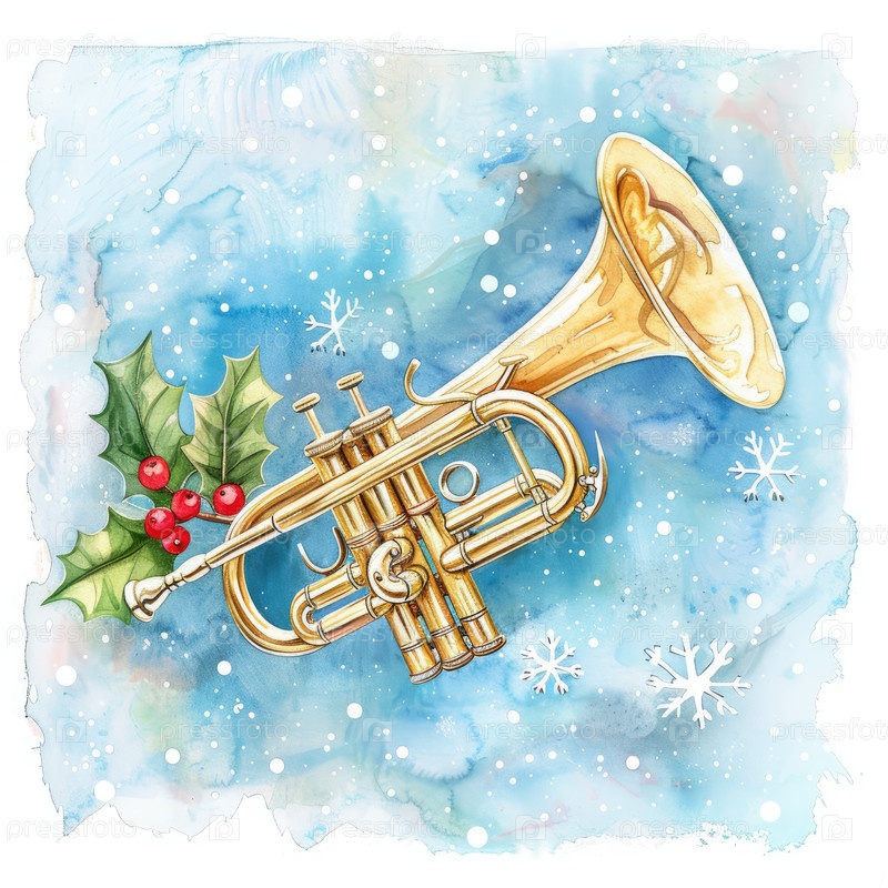 Красивая иллюстрация золотой трубы, украшенная обнаженными листьями и снежинками, посреди спокойной голубой зимы