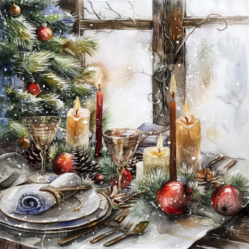 Красиво устроенный праздничный стол имеет свечи, украшения и рождественскую елку, создавая теплую праздничную атмосферу для торжеств