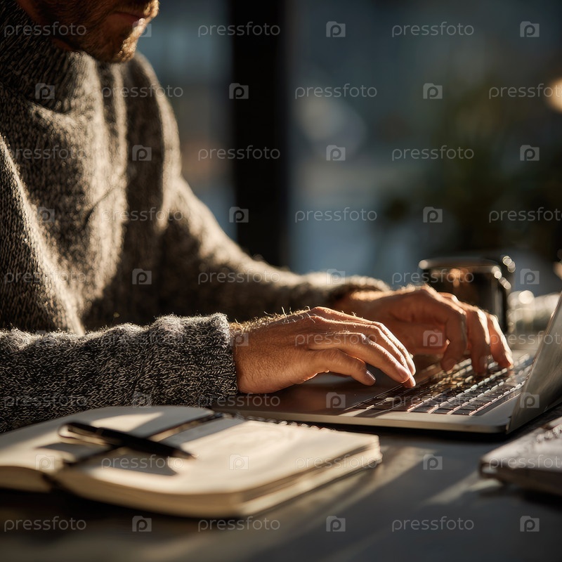 Мужчина-профессионал сосредоточен на печатании на ноутбуке в уютном рабочем пространстве, окруженном ноутбуком и теплым освещением, создавая продуктивную среду