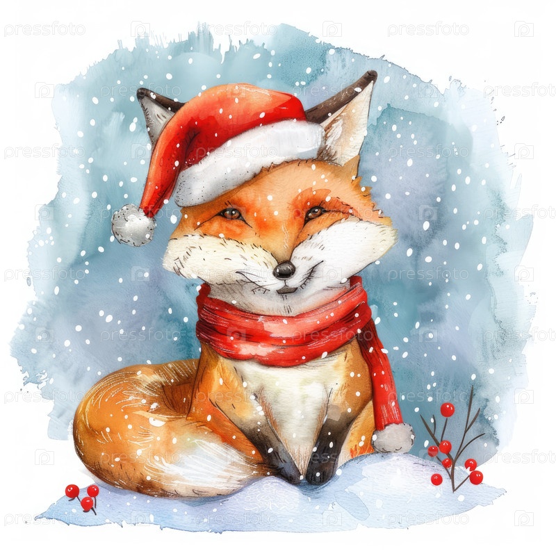 Очаровательная лиса, одетая в шляпу и шарф Санта-Клауса, окружена снежинками и зимними пейзажами, создавая праздничную атмосферу