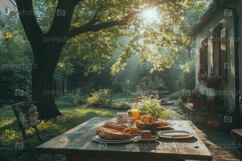 Красиво устроенный стол для завтрака с фруктами и выпечкой в тихом саду, где солнечный свет течет сквозь пышные деревья
