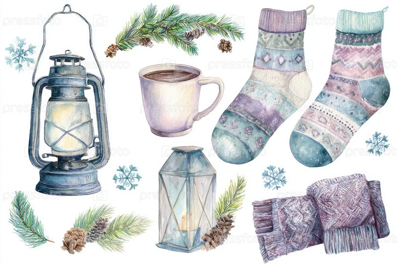 Уютная зимняя иллюстрация с фонарем, кружкой, носками и декоративными элементами для сезонного тепла