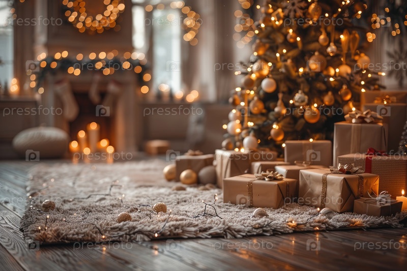 Уютная гостиная с украшенной рождественской елкой и красиво упакованными подарками